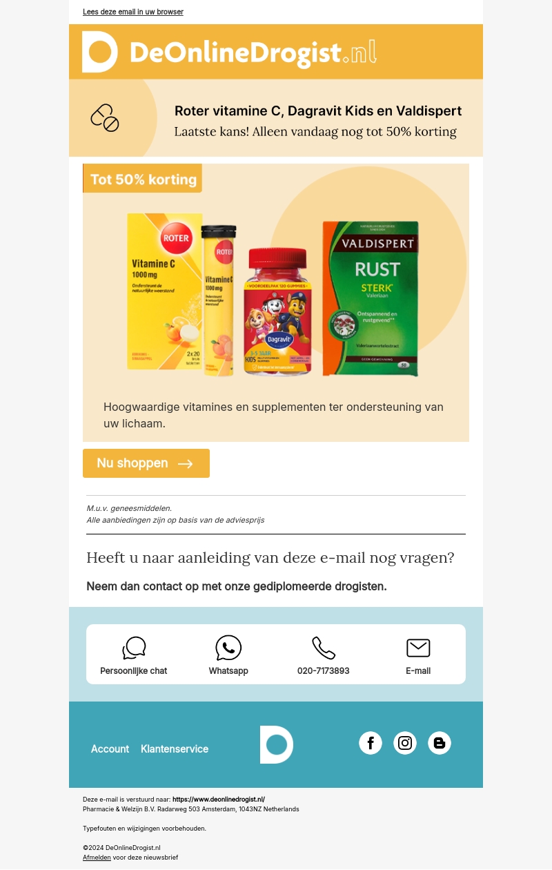 Profiteer alleen vandaag nog van kortingen tot wel 50% op hoogwaardige vitamines en supplementen van Roter, Dagravit en Valdispert. Deze aanbieding geldt uitsluitend vandaag. Shop nu en ondersteun uw gezondheid met de beste kwaliteit producten.