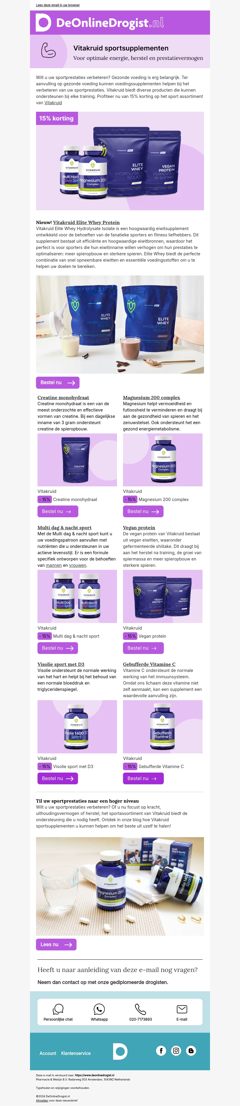 Wilt u uw sportprestaties verbeteren? Vitakruid biedt diverse voedingssupplementen die u kunnen helpen. Profiteer nu van 15% korting op het gehele Vitakruid assortiment. Ontdek de nieuwste producten zoals Elite Whey Proteïne en Creatine monohydraat.