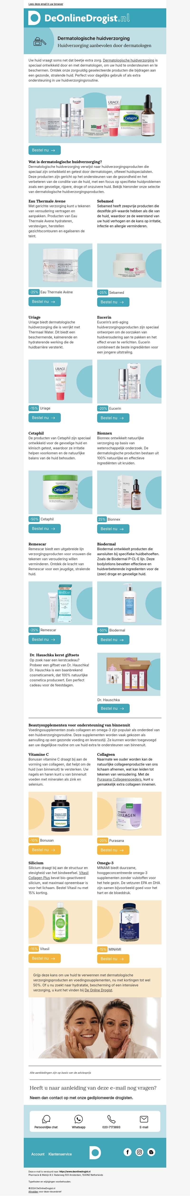Ontdek de dermatologische huidverzorging van DeOnlineDrogist.nl. Deze nieuwsbrief biedt een uitgebreide selectie producten om jouw huid extra zorg en bescherming te geven. Met merken zoals Eucerin, Uriage en Cetaphil ben je verzekerd van kwaliteit. Vind ook voedingssupplementen voor een stralende huid. Bestel nu en ervaar de ultieme verzorging.