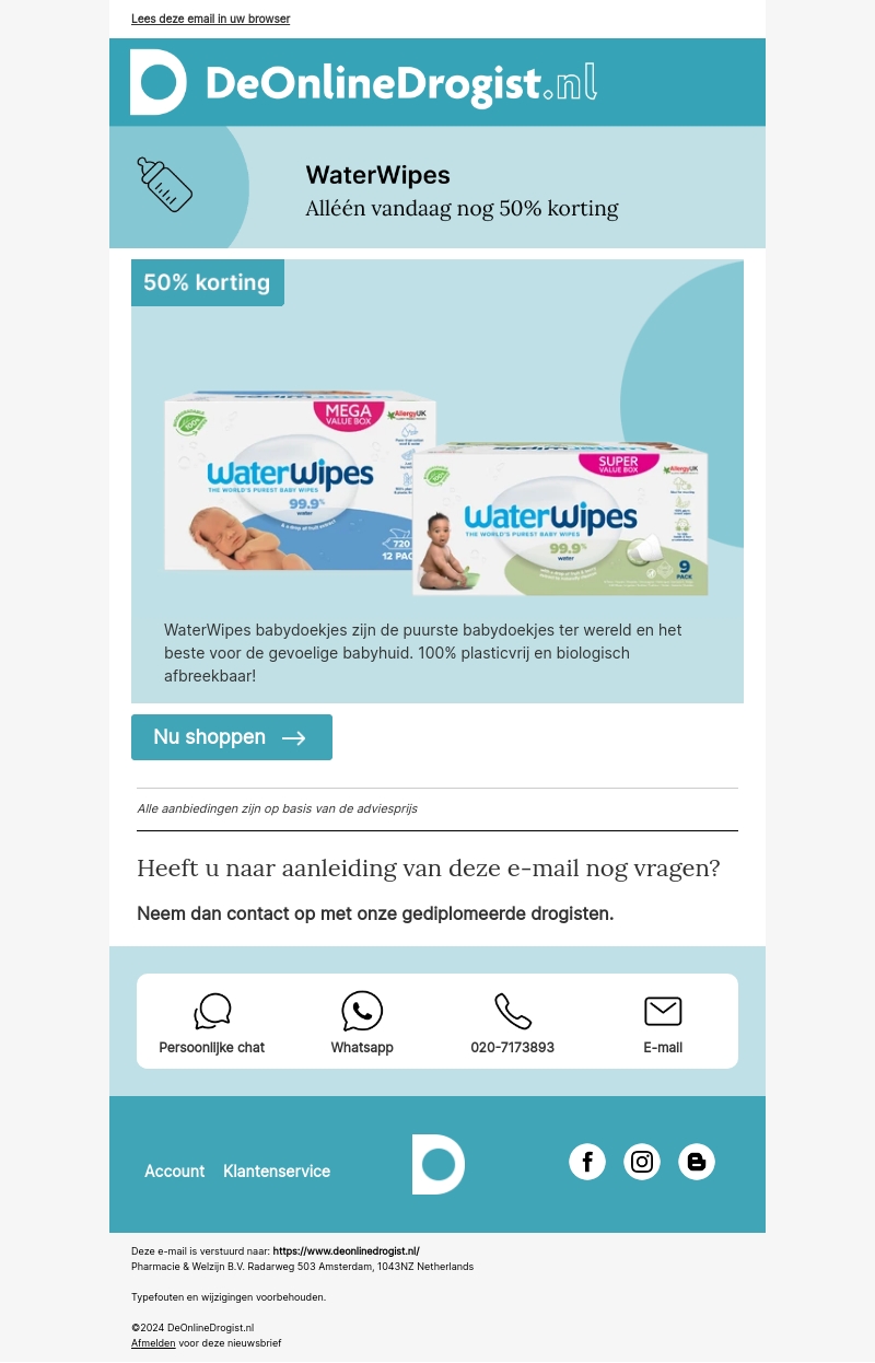 Profiteer vandaag van een geweldige aanbieding: 50% korting op WaterWipes babydoekjes! Deze ultra-pure babydoekjes zijn ideaal voor de gevoelige babyhuid, 100% plasticvrij en biologisch afbreekbaar. Perfect voor ouders die alleen het beste willen voor hun kleintjes.