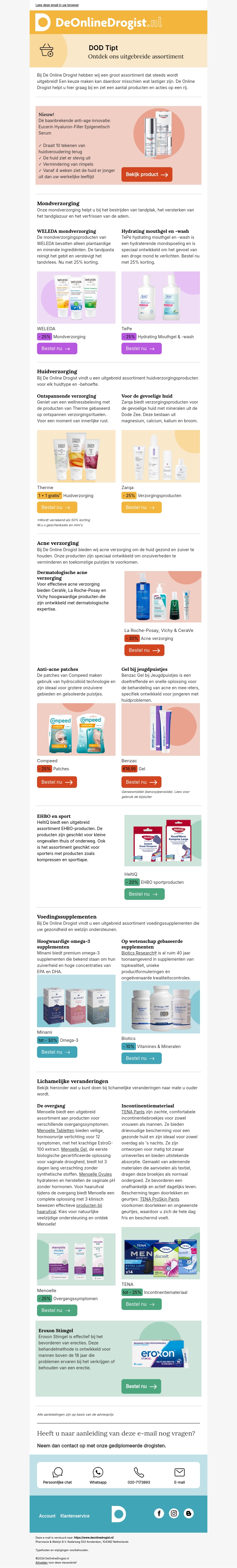 Bij De Online Drogist vind je het meest uitgebreide assortiment voor de beste prijzen. Ontdek onze mondverzorging, acne verzorging, voedingssupplementen en meer. Profiteer van de nieuwste aanbiedingen en topproducten om jouw gezondheid en wellbeing te ondersteunen.
