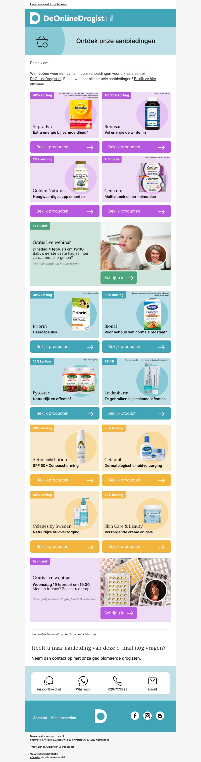 DeOnlineDrogist.nl biedt nu geweldige kortingen op topmerken. Profiteer van kortingen tot 50% op producten zoals Supradyn, Priorin en Actinica® Lotion. Meld je aan voor exclusieve webinars over baby's voeding en huidverzorging. Bezoek onze website voor meer informatie en om jouw voordeel te pakken!