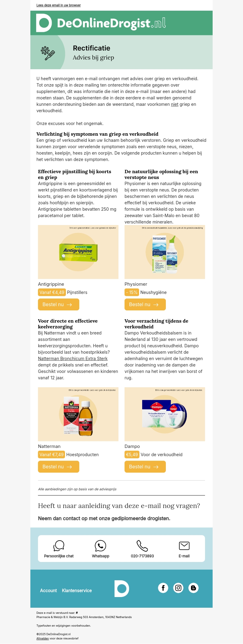 Heeft u last van griep of verkoudheid? Deze nieuwsbrief biedt u inzicht in verschillende producten zoals Antigrippine voor pijnstilling, en Physiomers voor neusverlichting. Lees verder voor meer aanbevelingen en aanbiedingen.