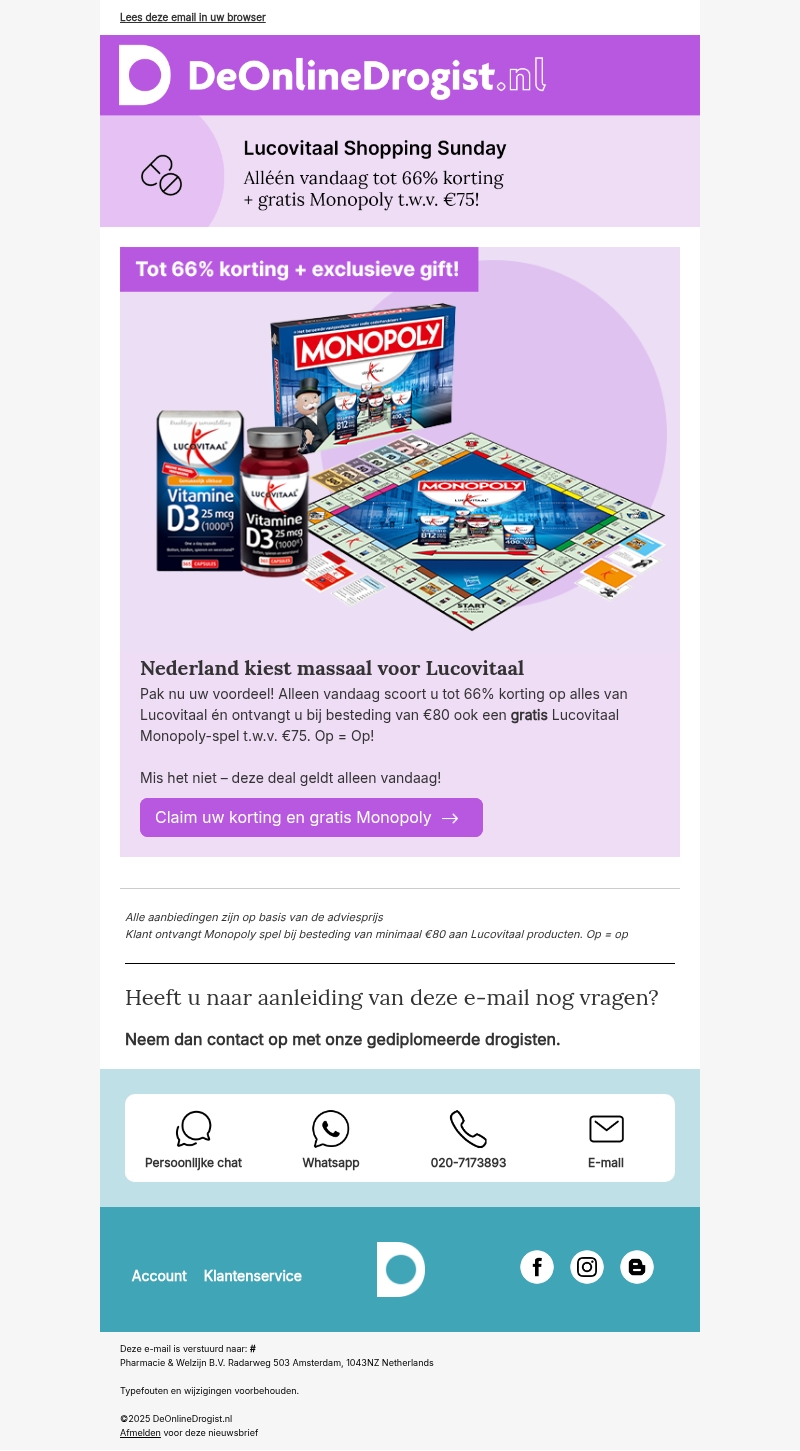 Ontdek de Lucovitaal Shopping Sunday bij DeOnlineDrogist.nl. Geniet van tot 66% korting op uw favoriete producten. Bij een minimale besteding van €80 ontvangt u bovendien een gratis Monopoly spel ter waarde van €75. Deze aanbieding is exclusief voor vandaag, dus mis het niet!