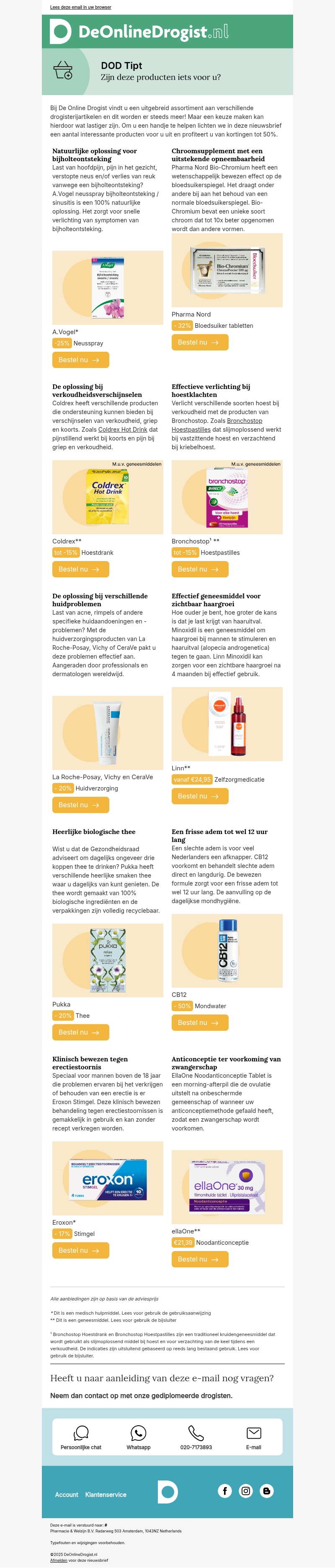 Bij De Online Drogist vindt u een ruime keuze aan drogisterijartikelen. Mis de nieuwe kortingen tot 50% op populaire producten niet! Ontdek oplossingen voor hooikoorts en verkoudheid, huidverzorging, en meer.