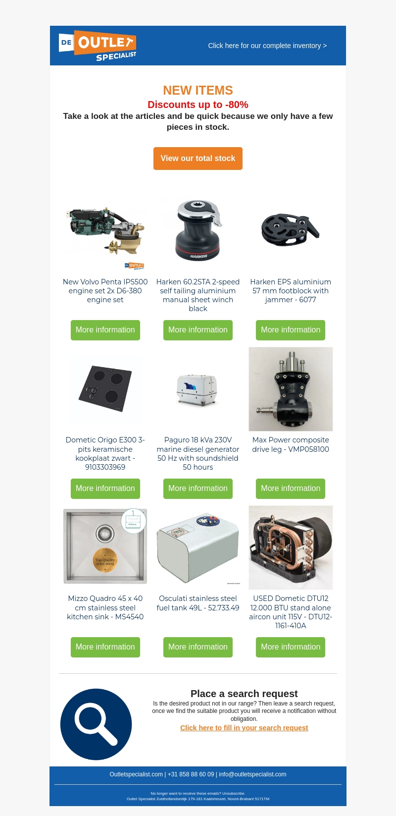 Ontdek de nieuwste producten met kortingen tot wel 80%! We hebben een beperkte voorraad, dus wees er snel bij. Bekijk artikelen van topmerken zoals Harken, Volvo Penta, Dometic en anderen. Klik voor meer informatie en shop de beste deals.