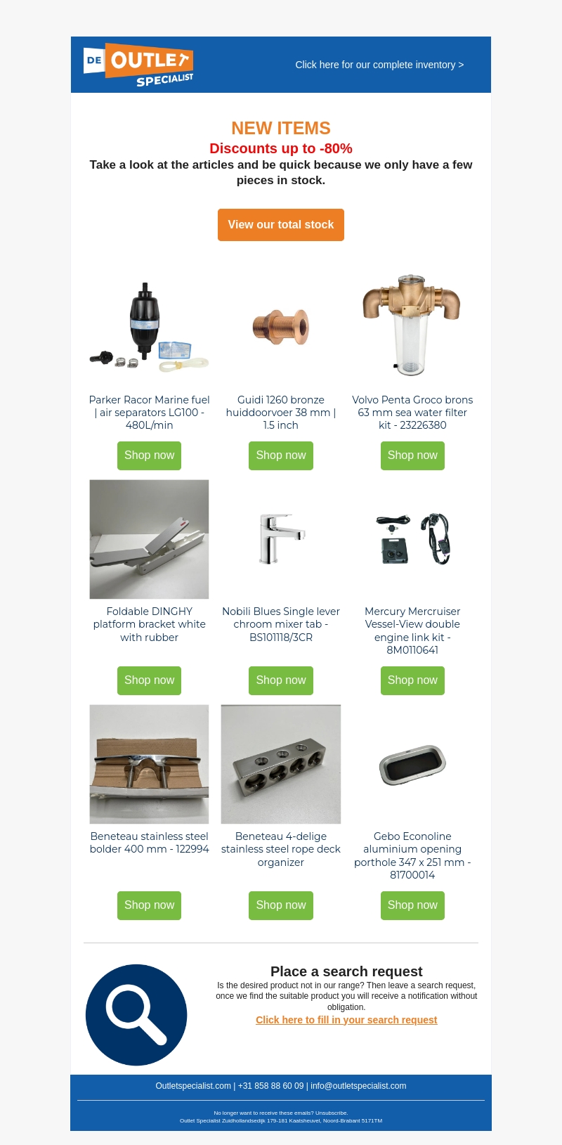 Nieuwe producten zijn gearriveerd bij Outlet Specialist met kortingen tot wel 80%. Van marine brandstofscheiders tot roestvrijstalen bolder, we hebben een breed scala aan producten. Wees er snel bij, want de voorraad is beperkt. Bekijk nu ons volledige assortiment voor de beste deals.