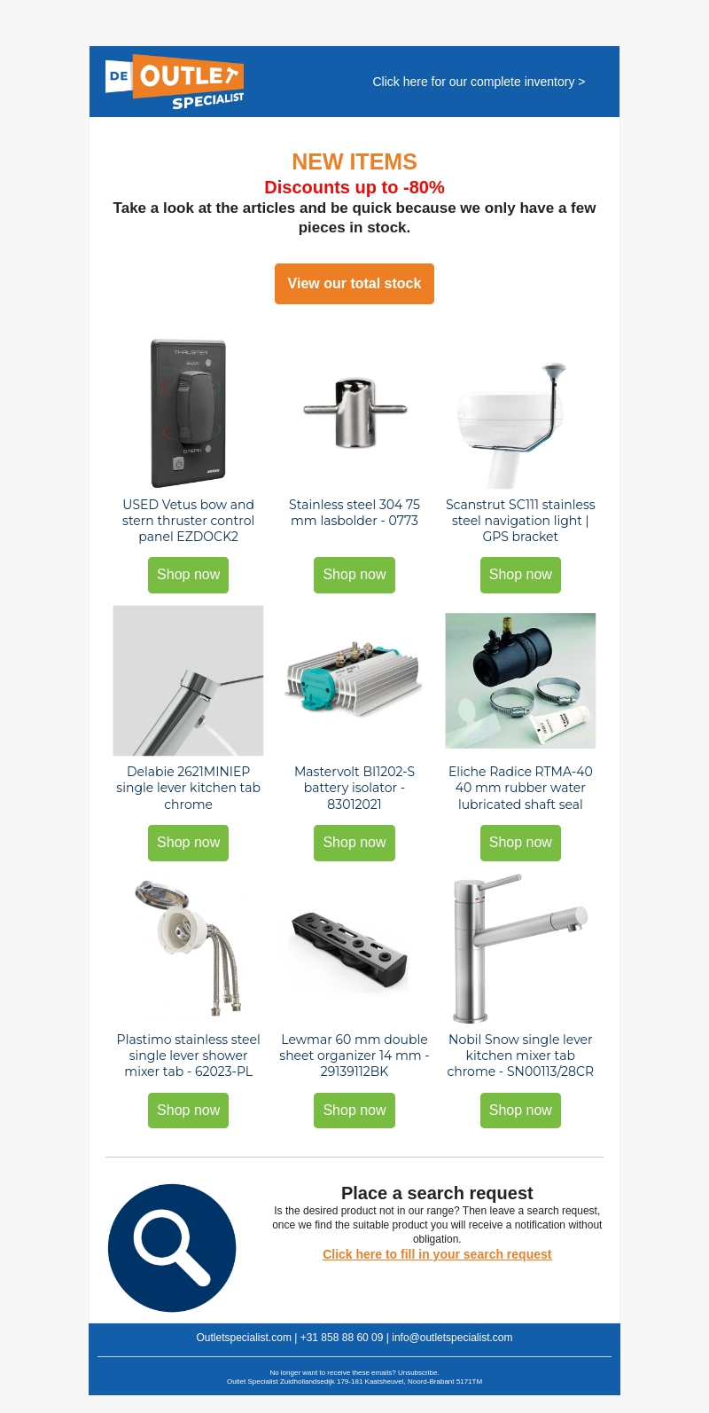 Welkom bij de Outletspecialist! We hebben nieuwe items toegevoegd van topmerken zoals Vetus, Scanstrut, Mastervolt, Lewmar en Plastimo. Profiteer van kortingen tot 80% op verschillende artikelen. Wees snel, want de voorraad is beperkt. Bekijk nu ons volledige assortiment en bespaar groot!