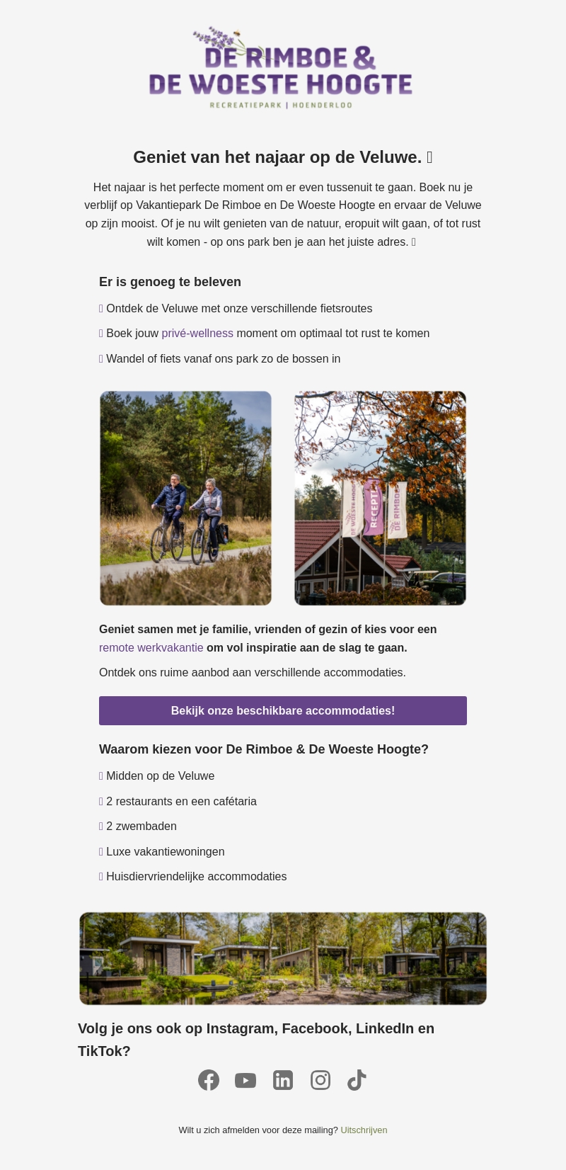 Ontdek de schoonheid van de Veluwe in de herfst bij Vakantiepark De Rimboe & De Woeste Hoogte. Geniet van fietsroutes, privΓ©-wellness, en ontspannen wandelingen. Boek nu en beleef een onvergetelijke vakantie te midden van de natuur.