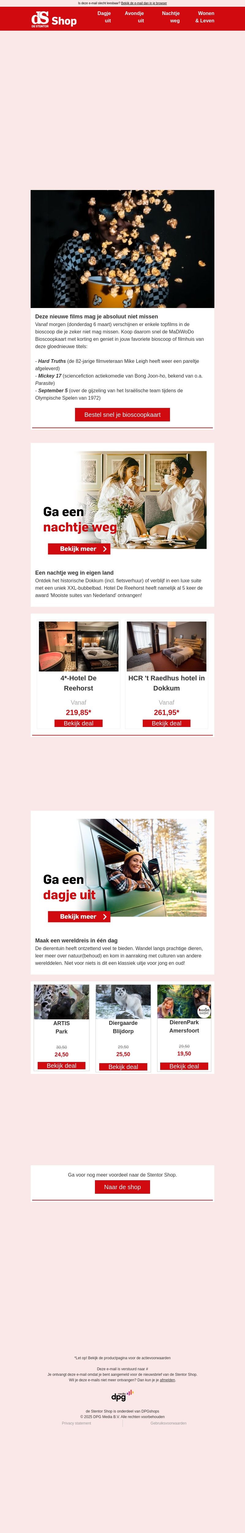 Deze nieuwsbrief brengt je de nieuwste filmreleases die je niet wilt missen. Ontdek spannende titels zoals 'Afad Trinds' en 'Mickey 17'. Daarnaast bieden we tips voor een nachtje uit in eigen land met bijzondere hoteldeals. Vergeet niet het ARTIS Park of de DierenPark Amersfoort voor een leuk dagje uit.