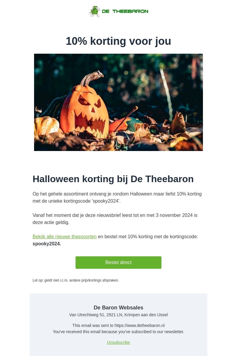 Vier Halloween met De Theebaron en profiteer van 10% korting op het volledige assortiment. Gebruik de kortingscode spooky2024 op uw aankopen. Deze aanbieding is geldig tot en met 3 november 2024. Ontdek onze nieuwste theesoorten en bestel direct.