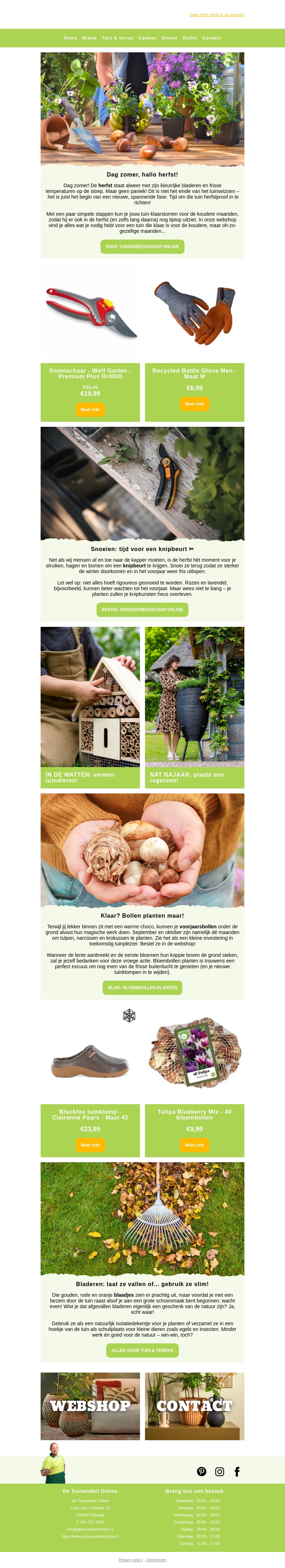 Dag zomer, hallo herfst! Het is tijd om je tuin klaar te maken voor het najaar. Wij bieden handige tuinproducten en nuttige tips om je tuin in topconditie te houden. Verwen je tuin nu met onze aanbevelingen.