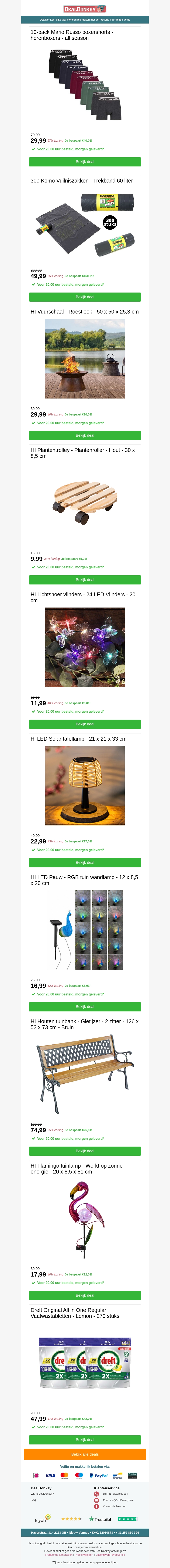 DealDonkey heeft de nieuwste aanbiedingen voor u verzameld. Van Mario Russo boxershorts tot vuilniszakken en tuindecoraties, er is voor ieder wat wils. Mis ook niet de geweldige deals op vuurschalen en LED-lampen. Profiteer van deze kortingen en koop nu!