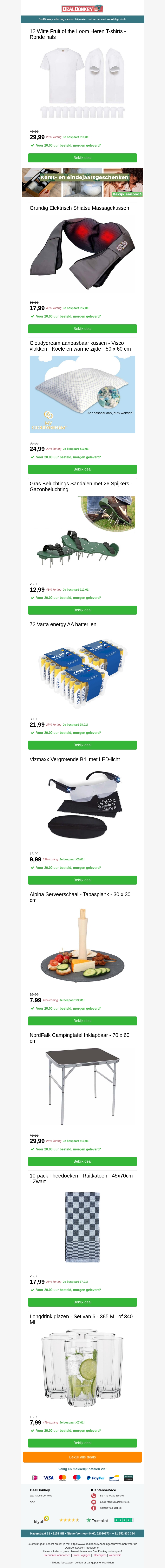 Deze nieuwsbrief biedt geweldige aanbiedingen op witte T-shirts, comfortabele hoofdkussens, Varta batterijen en stijlvolle theedoeken. Profiteer van de lage prijzen op hoogwaardige producten voor dagelijks gebruik. Of je nu op zoek bent naar nieuwe kleding of keukengerei, deze deals zijn te goed om te missen.