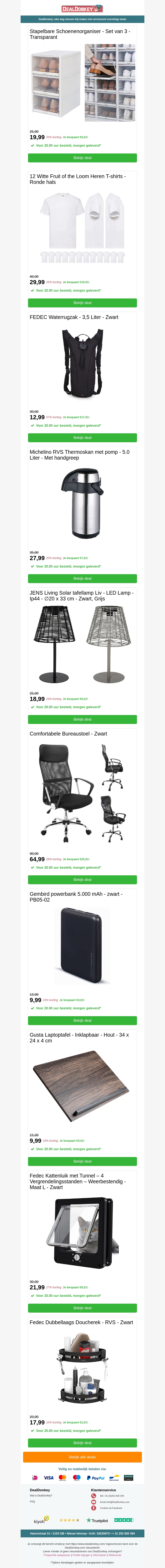Deze nieuwsbrief biedt u een reeks fantastische aanbiedingen, waaronder stapelbare schoenenorganisers, multifunctionele waterzakken, stijlvolle tafellampen, comfortabele bureaustoelen, krachtige powerbanks en praktische laptoptafels. Profiteer nu van deze geweldige deals en organiseer uw huis en werkplek efficiënt!