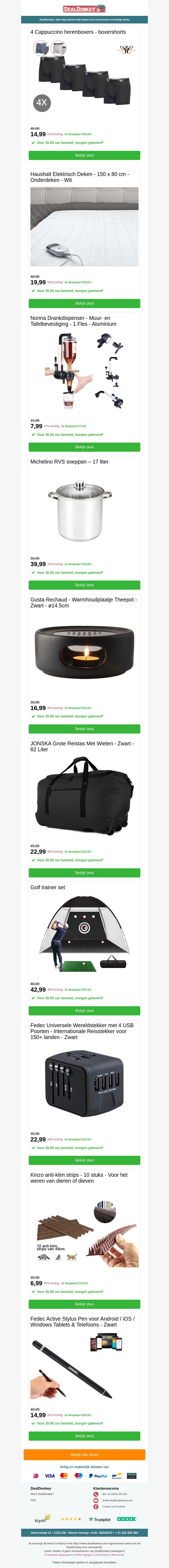 Profiteer van onze nieuwste aanbiedingen met kortingen op een breed scala aan producten. Van comfortabele Cappuccino herenboxers tot handige keukenhulpmiddelen zoals een pizzaschep. Maak je huis compleet met een kamerscherm en werk efficiënter met professionele gereedschappen zoals een cirkelzaag en steekwagen. Mis de unieke aanbiedingen niet.