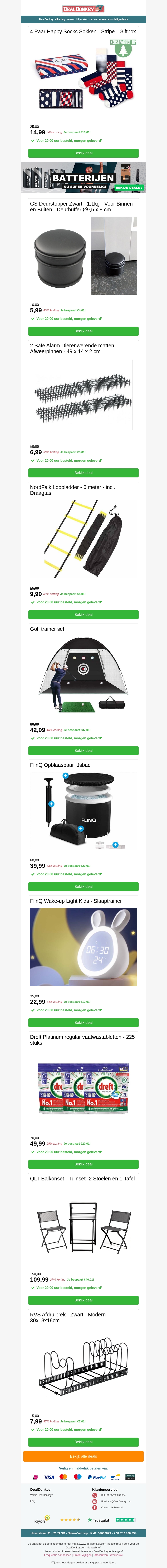 Verwen jezelf met geweldige aanbiedingen zoals de trendy Happy Socks, handige golf trainer sets en vernieuw je huis met slimme huishoudelijke producten. Profiteer van de nieuwste kortingen op batterijen, vaatwastabletten en stijlvolle balkonsets. Mis de kans niet om te besparen op jouw favoriete items van topmerken.