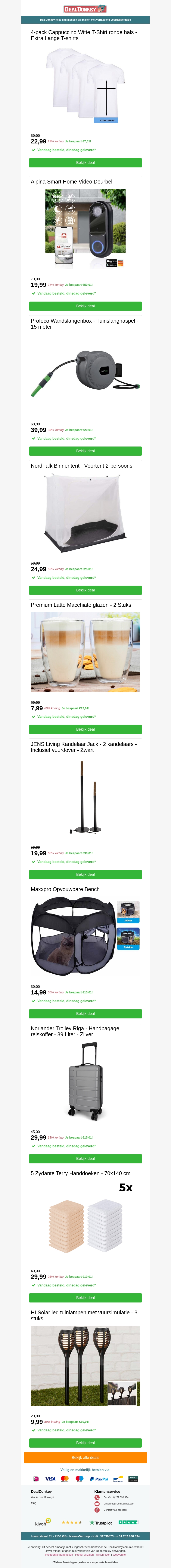 Grijp nu je kans met onze fantastische deals, van $4-pack cappuccino witte T-shirts tot een handige wandslangenbox. Of je nu op zoek bent naar een binnentent, stijlvolle kandelaars, een ruime trolley of decoratieve raamfolie, er is voor ieder wat wils. Verken onze aanbiedingen en bespaar vandaag nog!