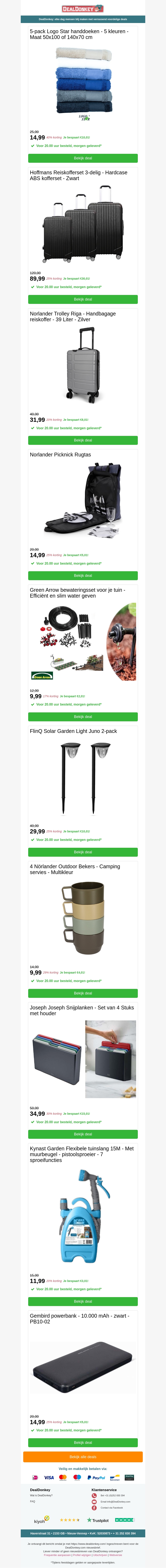 In deze nieuwsbrief bieden wij u een exclusieve selectie van producten, waaronder $5 Logo Star handdoeken, een handbagage reiskoffer, een picknick rugzak, een bewateringsset voor in de tuin met een tuinslang en meer. Bekijk onze nieuwste deals en verbeter uw dagelijks leven met deze handige en betaalbare producten. Grijp uw kans om fantastisch te besparen op kwaliteitsartikelen.