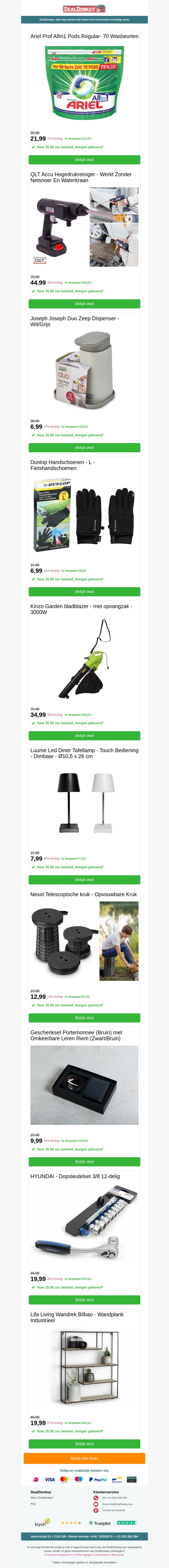 Welkom bij de nieuwste nieuwsbrief van DealDonkey! Deze week hebben we een scala aan producten met aantrekkelijke kortingen voor je verzameld. Van huishoudelijke artikelen zoals Ariel Pods en handige keukenhulpmiddelen, tot stijlvolle led-lampen en nog veel meer. Mis deze kans niet om te profiteren van onze geweldige aanbiedingen. Scoor jouw favoriete producten tegen scherpe prijzen!