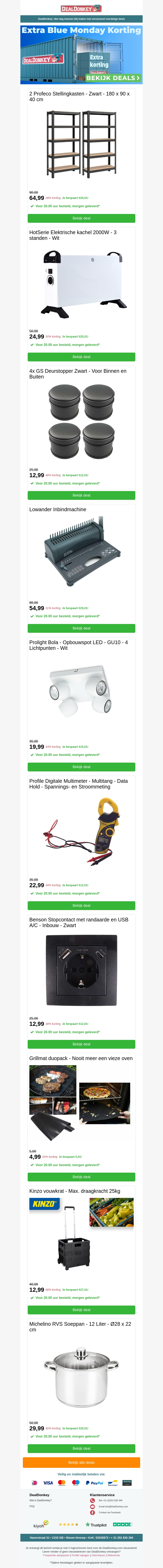 Verwen jezelf met fantastische aanbiedingen tijdens Blue Monday! Ontdek een breed scala aan producten van stellingen en kachels tot keukenapparatuur en meer. Deze aanbiedingen zijn speciaal geselecteerd om jouw dag op te vrolijken. Mis deze kans niet en bespaar op topkwaliteit producten. Bezoek onze website voor de volledige selectie deals.