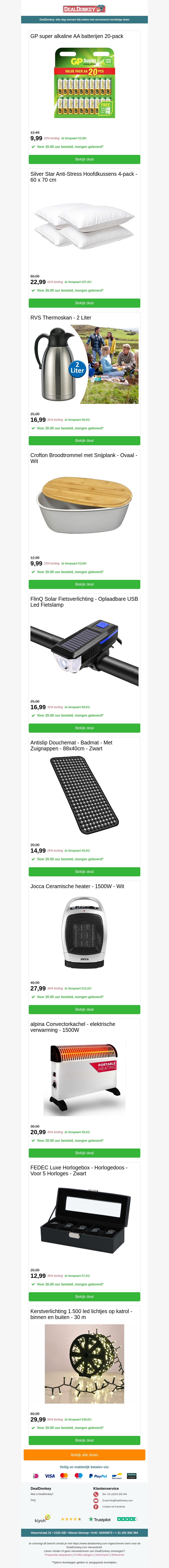 Deze nieuwsbrief toont geweldige deals voor verschillende producten zoals batterijen, kussens, thermoskannen, en meer. Profiteer van kortingen op zowel praktische items als sfeervolle decoraties. Mis de kans niet om je huis en tuin te vernieuwen met onze exclusieve aanbiedingen. Bekijk de nieuwste selectie en bespaar direct. Perfecte cadeaus en benodigdheden voor elk seizoen. Ontvang de beste deals met onze tips.
