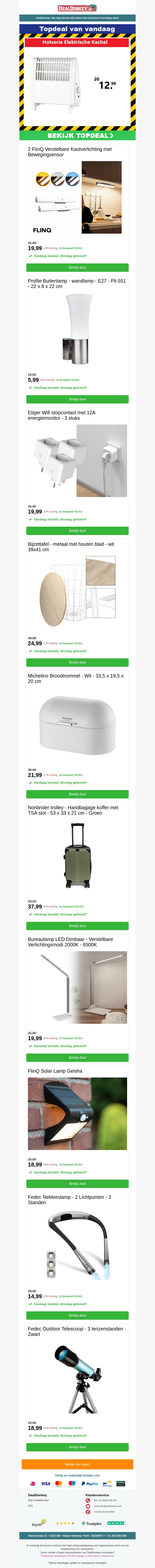 Bekijk onze laatste aanbiedingen, van elektrische kachels tot stijlvolle tafellampen. Profiteer nu van de geweldige kortingen. Mis het niet!