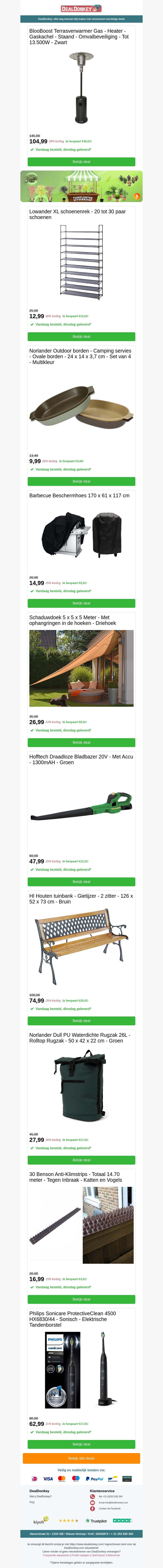 Vind de beste aanbiedingen voor jouw tuinbehoeften, zoals de Blooboost Terrasverwarmer, een handige barbecue beschermhoes, en een schaduwdoek van hoogwaardige kwaliteit. Zorg dat je tuin klaar is voor elk seizoen met onze geselecteerde producten.