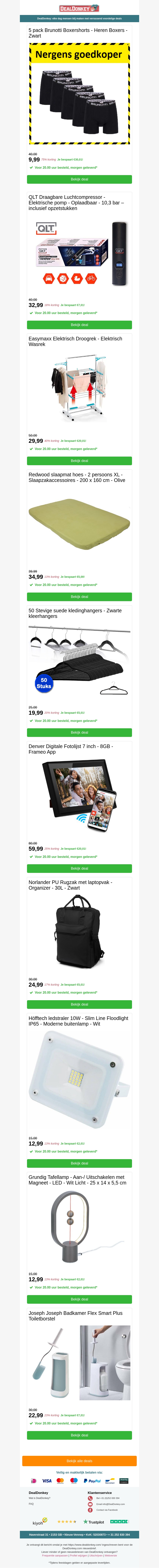 Bespaar vandaag nog met onze geweldige aanbiedingen op Brunotti Boxershorts, Elektrisch Droogrek, Slaapmathoes, Kledinghangers en Digitale Fotolijst. Profiteer van scherpe prijzen en handige producten voor elk huishouden. Mis het niet!
