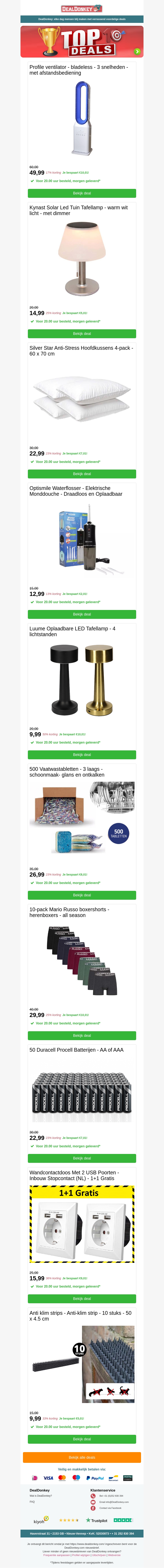 Mis deze kans niet om geweldige deals te scoren op verschillende producten! Van efficiënte ventilatoren tot luxe tafellampen en duurzame batterijen, er is voor ieder wat wils. Bekijk onze top 10 populairste deals van dit moment en bespaar enorm. Elke aanbieding is zorgvuldig geselecteerd voor de beste kwaliteit en prijs. Koop snel, want op is op!