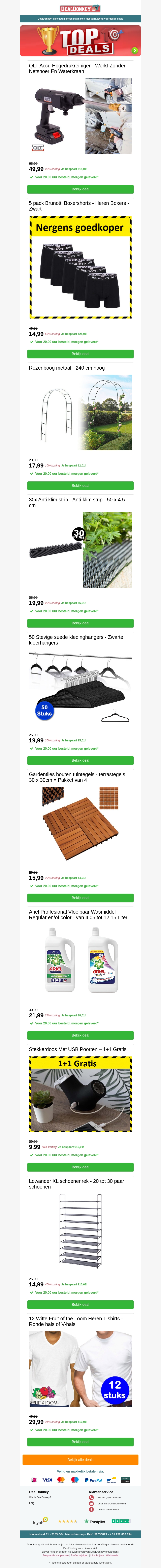 Mis deze top deals niet op DealDonkey! Ontdek de beste aanbiedingen op gereedschap, kleding en woonaccessoires. Bespaar nu op producten zoals de QLT Accu Hogedrukreiniger, Brunotti Boxershorts, en nog veel meer. Bezoek DealDonkey voor meer informatie en profiteer van geweldige kortingen.