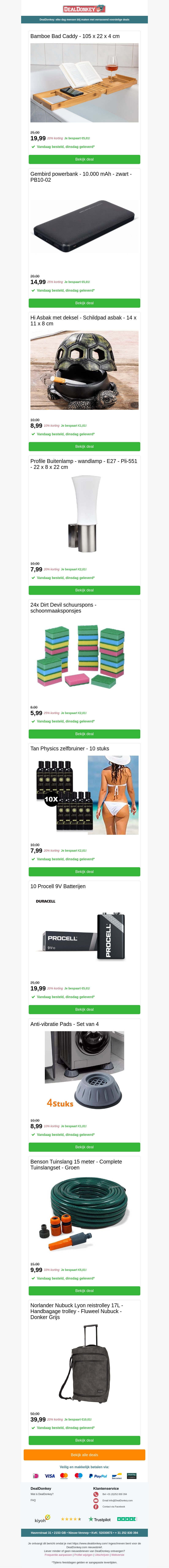 Deze nieuwsbrief bevat de top 10 weekend deals met extra korting. Van een luxe bad caddy tot handige powerbanks en meer, er zijn vele producten die je niet wilt missen. Profiteer van de extra voordelige prijzen en bestel snel. Bekijk alle aanbiedingen in deze nieuwsbrief om jouw favoriete deal te vinden.