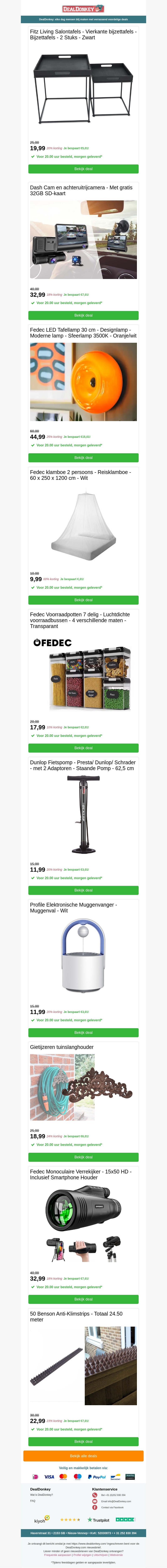 Bekijk de nieuwste aanbiedingen bij DealDonkey. Van stijlvolle Fitz Living salontafels tot handige reisaccessoires zoals de Fedec Klamboe en luchtdichte voorraadpotten. Ontdek ook efficiënte producten zoals de Dash Cam met achteruitrijcamera, tuinslanghouder en muggenvanger. Mis de deals niet!