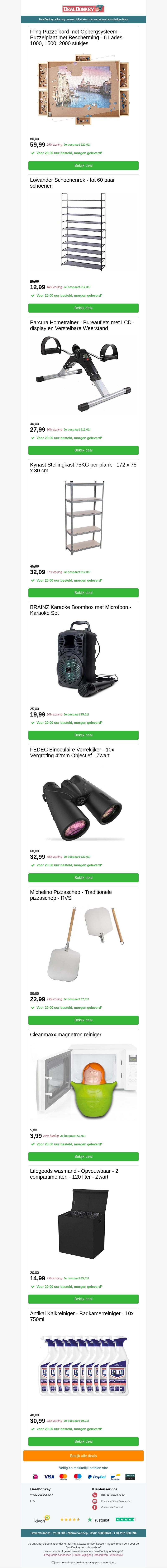 Mis deze kans niet op fantastische kortingen op FlinQ-producten! Of je nu op zoek bent naar een puzzelbord, een hometrainer, of een handige stellingkast, we hebben het allemaal. Bovendien hebben we een krachtige boombox en een verrekijker voor alle avonturiers. En vergeet de pizzaschep niet voor de perfecte pizza-avond! Profiteer van deze deals en bespaar meer.