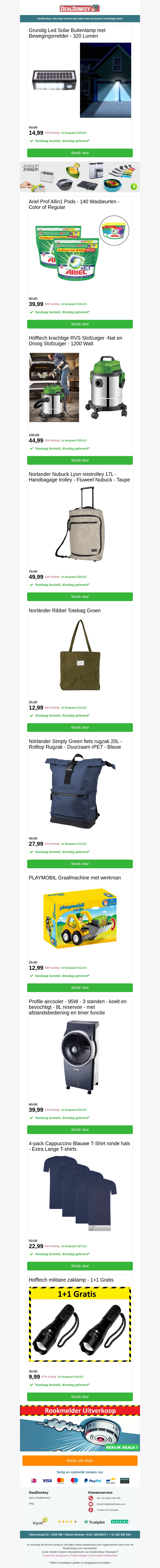 Welkom bij de nieuwste DealDonkey nieuwsbrief! Ontdek geweldige aanbiedingen zoals Grundig LED-lampen, Ariel pods, krachtige stofzuigers, reistassen, speelsets en meer. Profiteer van deze fantastische deals zolang de voorraad strekt. Mis het niet en shop nu!
