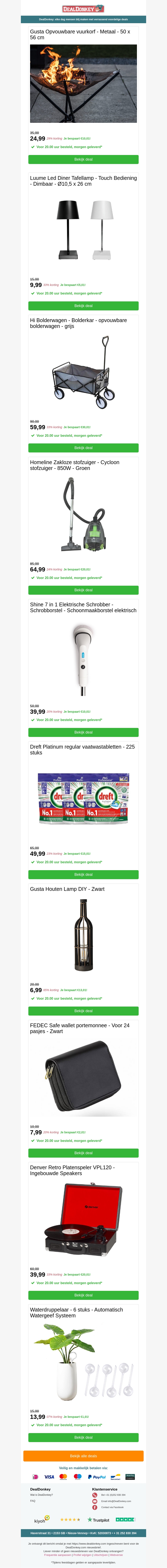 Bekijk de nieuwste aanbiedingen bij DealDonkey.nl. Van de opvouwbare vuurkorf van $Gusta tot de multifunctionele bolderkar, krachtige stofzuiger, Dreft vaatwastabletten en stijlvolle portemonnee. Mis deze geweldige deals niet en shop nu!