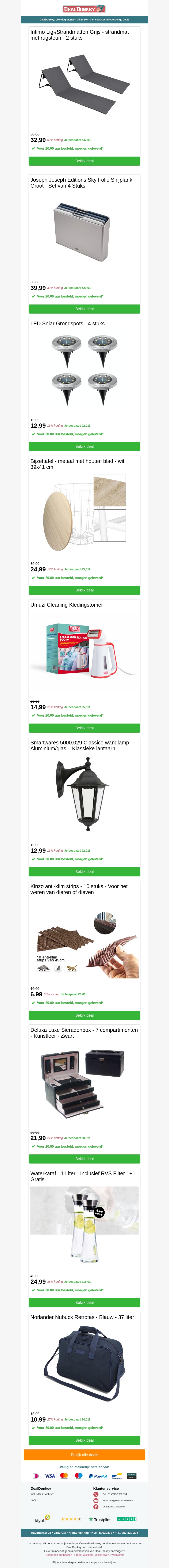Deze nieuwsbrief presenteert topaanbiedingen op diverse producten, waaronder Intimo lig/strandmatten, een stijlvol metalen bijzettafel, een efficiënte kledingstomer, elegante SOLAR grondspots en een prachtig wandlamp. Mis de kans niet om deze geweldige deals te pakken en van je aankopen te genieten.