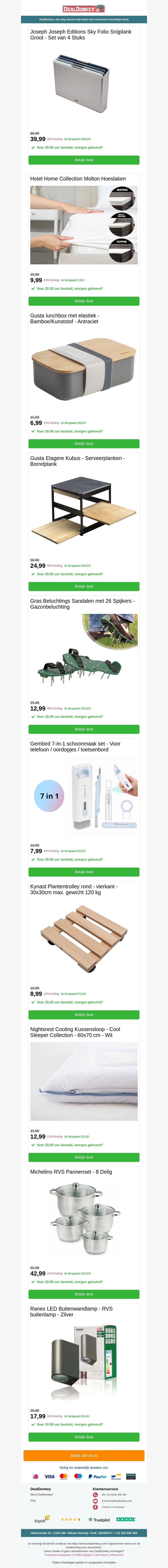 Profit from great discounts on various products. Check out the Joseph Joseph Editions Sky Folio Snijplank, Hotel Home Collection Molton Hoeslaken, Gusta Lunchbox, and more. Equip your kitchen with top-notch items or improve your garden with our lighting solutions.