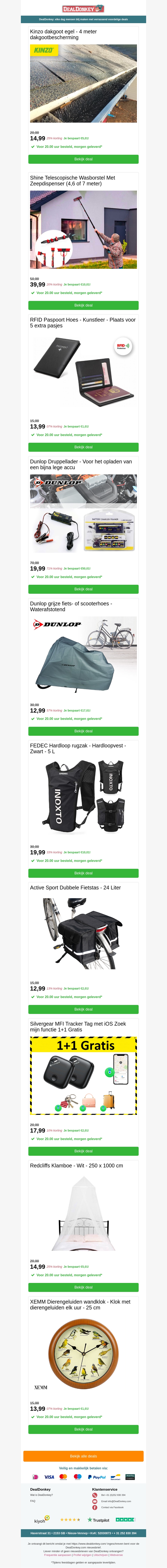Ontdek de nieuwste aanbiedingen op DealDonkey.nl! Bescherm je dakgoot met de Kinzo dakgoot egel voor slechts €14,99 en blijf veilig online met de RFID paspoorthoes voor €13,99. Geniet van een slimme druppellader van Dunlop, praktische scooterhoes en een comfortabele hardloop rugzak van FEDEC. Ook verkrijgbaar: een 1+1 gratis Silvergear mini tracker tag en een stijlvolle klamboe.