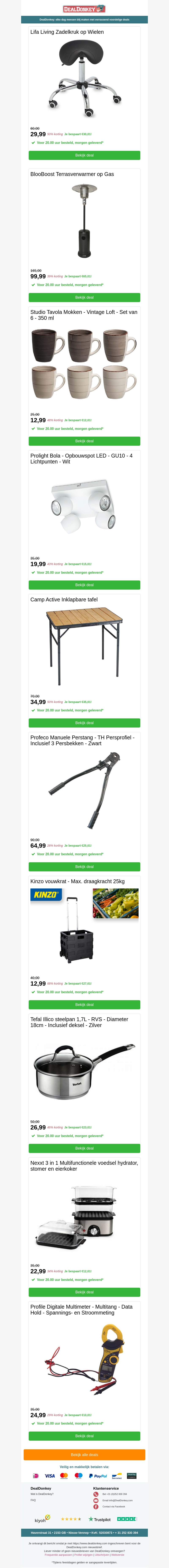 Deze nieuwsbrief biedt een gevarieerd aanbod aan huisartikelen tegen scherpe prijzen. Ontdek de stijlvolle Lifa Living zadelkrukken en praktische opbouwspots met LED-verlichting. Daarnaast vindt u duurzame mokkensets en handige inklapbare tafels. Profiteer van de scherpste aanbiedingen en geef uw interieur een upgrade met deze topartikelen.
