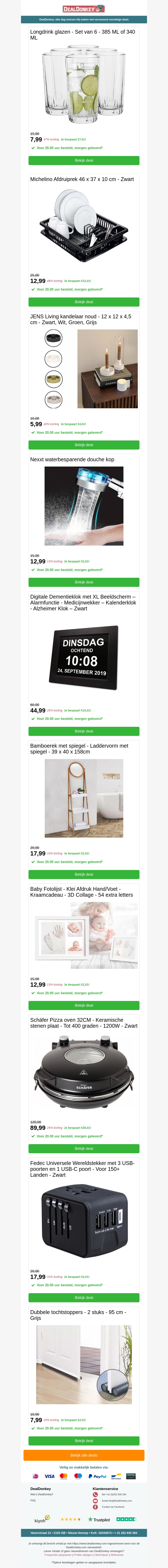 Mis deze geweldige deals niet! We hebben longdrink glazen, een efficiënte afwas rek, moderne kandelaar, waterbesparende douchekop, digitale dementieklok, elegante kledingrek, unieke baby fotolijst, snelkookpan, wereldreis stekker, en functionele deurbeschermers.