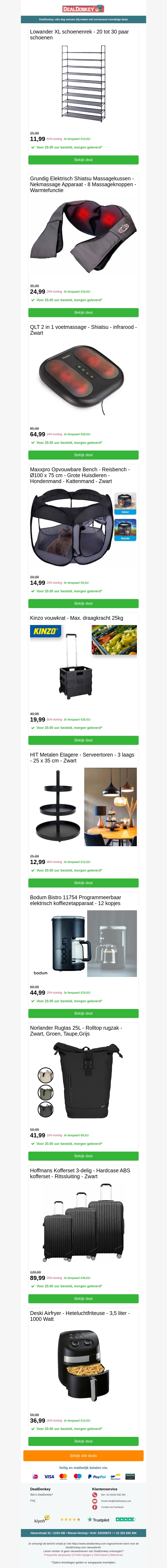 Profiteer nu van ongelooflijke deals op verschillende producten zoals het Lowander XL Schoenenrek, een voetenmassage-apparaat, een praktische reisbench, en een handige vouwkrat. Voeg hierbij ook een hoogwaardige koffiezetapparaat aan uw keuken toe. Mis deze unieke aanbiedingen niet!