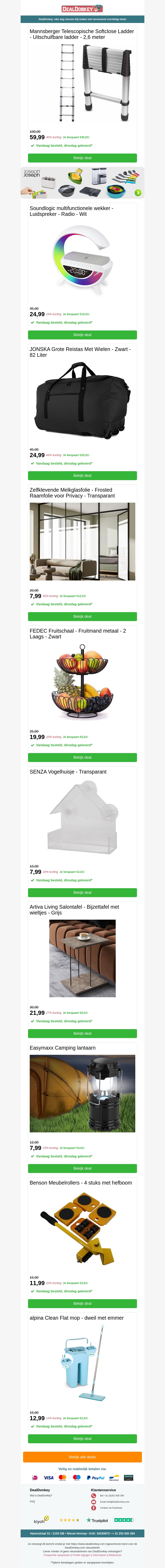 Bekijk onze nieuwste aanbiedingen met kortingen op een verscheidenheid aan producten zoals telescopische ladders, handige reistassen, stijlvol melkglasfolie, krachtige camping lantaarns en stevige meubelrollers. Mis deze kans niet om uw huis en buitenactiviteiten te verbeteren.