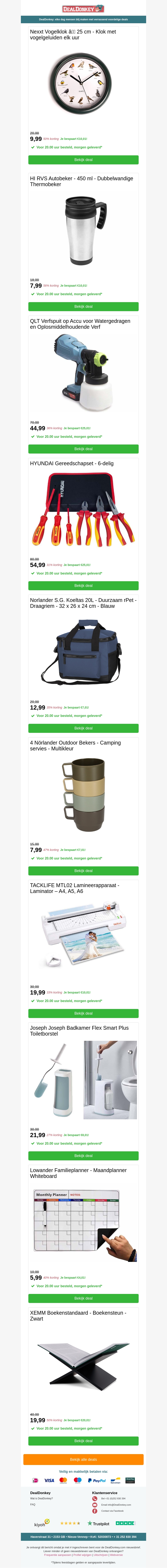 Deze nieuwsbrief presenteert een reeks aanbiedingen, waaronder een Vogelklok, Accu Verfspuit, en een gereedschapset. Vind ook deals op koeltassen en lamineerapparaten. Perfect voor handige klussers en liefhebbers van praktische hebbedingen.