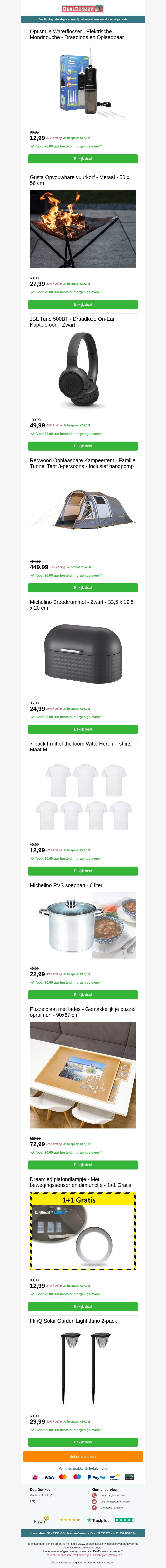 Bij DealDonkey hebben we weer fantastische aanbiedingen voor u! Ontdek de draadloze waterflosser voor een stralend gebit, een ruime opblaasbare kampeertent voor het hele gezin, een stijlvolle broodtrommel, een praktische soeppan en een handige puzzelplaat met lades. Bekijk snel deze deals en profiteer van scherpe prijzen!