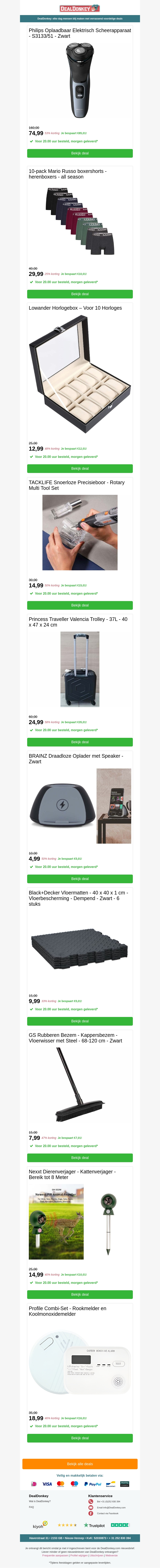 Verwen jezelf met het nieuwste Philips elektrisch scheerapparaat. Bewaar je horloges stijlvol met onze luxe horlogebox. Ontdek de precisie van onze multi-toolset en reis comfortabel met de veelzijdige trolley. Houd ongewenste katten weg met onze innovatieve kattenverjager.