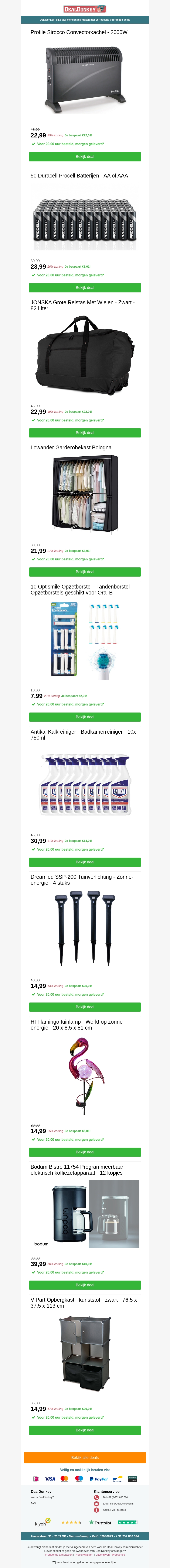 Duik in onze gevarieerde selectie van producten zoals de convectorkachel en stijlvolle tuinverlichting. Ontdek handige reisaccessoires, een ruime garderobekast, en een krachtige kalkreiniger. Sluit je winkelervaring af met een modern koffiezetapparaat.
