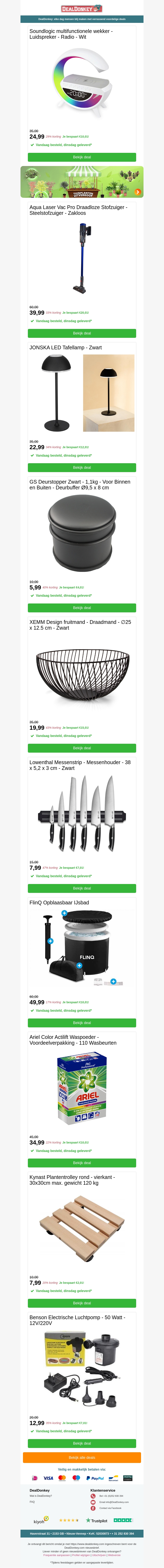 Bekijk de nieuwste aanbiedingen op ons platform, inclusief de Soundlogic-smarthorloge, trendy tafellampen, multifunctionele deurstoppers, stijlvolle fruitmanden en handige messenstrips. Mis deze kans niet om te profiteren van hoge kortingen en exclusieve aanbiedingen.