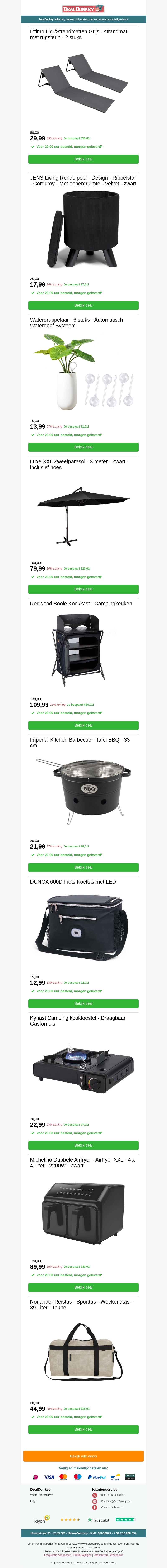 Verken onze nieuwste aanbiedingen inclusief strandmatten met rugsteun, waterdruppelaren, fietszakken, camping kooktoestellen en XXLzweefparasols. Deze deals zijn perfect voor uw zomerse avonturen en buitenactiviteiten. Mis deze geweldige kortingen niet!