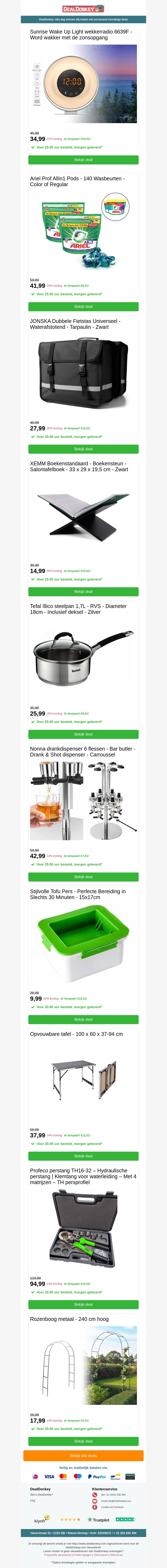 Deze nieuwsbrief staat boordevol geweldige deals op diverse huishoudelijke artikelen. Van een sunrise wake-up light tot handige fietstassen en keukenbenodigdheden zoals een steelpan en tofu-pers. Profiteer van de deals en vernieuw uw huis met kwaliteitsproducten. Mis ook niet de speelse items zoals een perstang en fietsmand voor meer gemak. Ontdek al deze aanbiedingen en meer in onze nieuwsbrief.